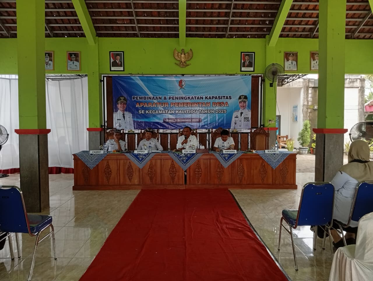 Kalitidu, (03/12/2025) Pembinaan dan Peningkatan Kapasitas Aparatur Pemerintahan Desa se- Kecamatan Kalitidu Tahun Anggaran 2025 di Pendopo Desa Pungpungan Kecamatan Kalitidu Kabupaten Bojonegoro yang dilaksanakan pada hari ini, dimana peserta setiap desa berjumlah 5 orang diantaranya dari unsur Kepala Desa 1 orang, Sekretaris Desa 1 orang, Bendahara Desa 1 orang, Ketua BPD 1 orang dan Timlak BKKD 1 orang.